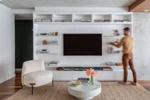 O designer carioca Brunno Jahara nos mostra como o piso de madeira pode ser utilizado de forma criativa e inovadora. Em seu apartamento em Botafogo, Rio de Janeiro, Jahara optou por um piso de madeira branca, que harmoniza perfeitamente com as paredes e tetos claros.