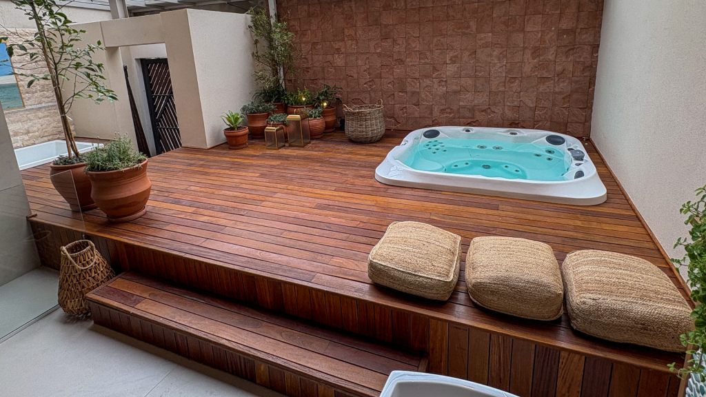 Nesse projeto, a Akafloor está presente com o Deck Akafloor Cumaru, Piso Akafloor Tauari Maturite 10cm e Piso Akafloor Tauari Du Lait 10 cm, reforçando a proposta de sofisticação, naturalidade e acolhimento.
