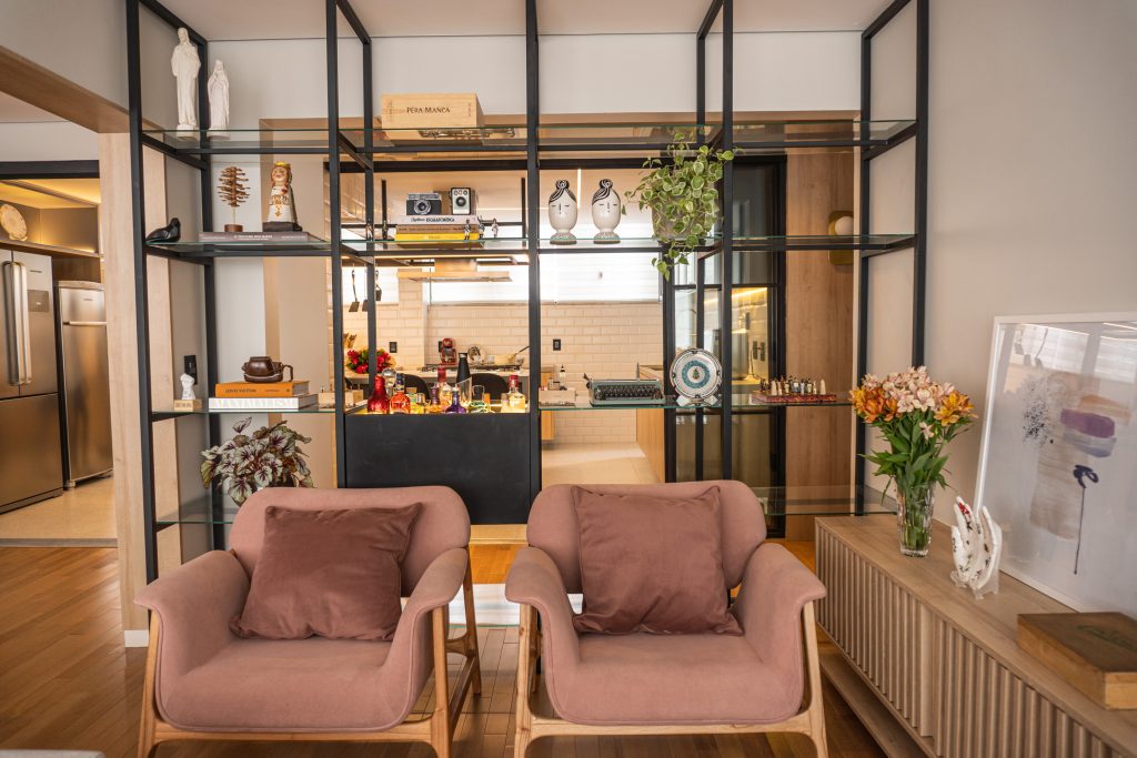 Entre a cozinha e a área social uma divisória vazada dispõe de bar e estante. O piso Tauari Caramel, da Akafloor, combina com os móveis de madeira. Versáteis e elegantes, as réguas mais estreitas são especialmente indicadas para apartamentos compactos, dormitórios e corredores, onde ampliam a percepção espacial e reforçam a unidade visual. O resultado são interiores sofisticados, funcionais e marcados pelo cuidado no desenho e na escolha dos materiais.